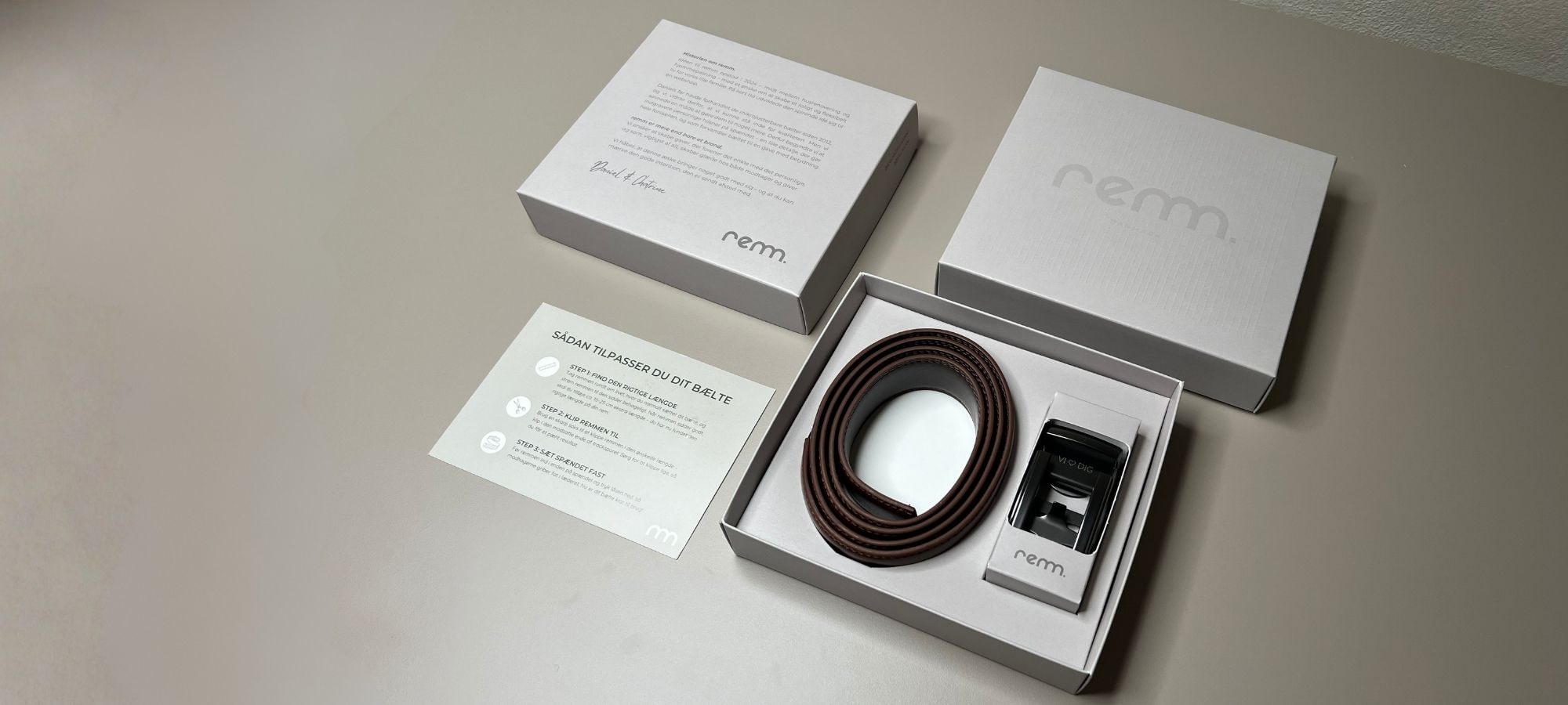 Hos remm har vi en simpel mission: at gøre det nemt at sige tak på en meningsfuld og stilfuld måde. Det gør vi ved at tilbyde kvalitets læderbælter uden huller med mulighed for personlig indgravering. Den perfekte gave til dig selv eller ham, du holder af.